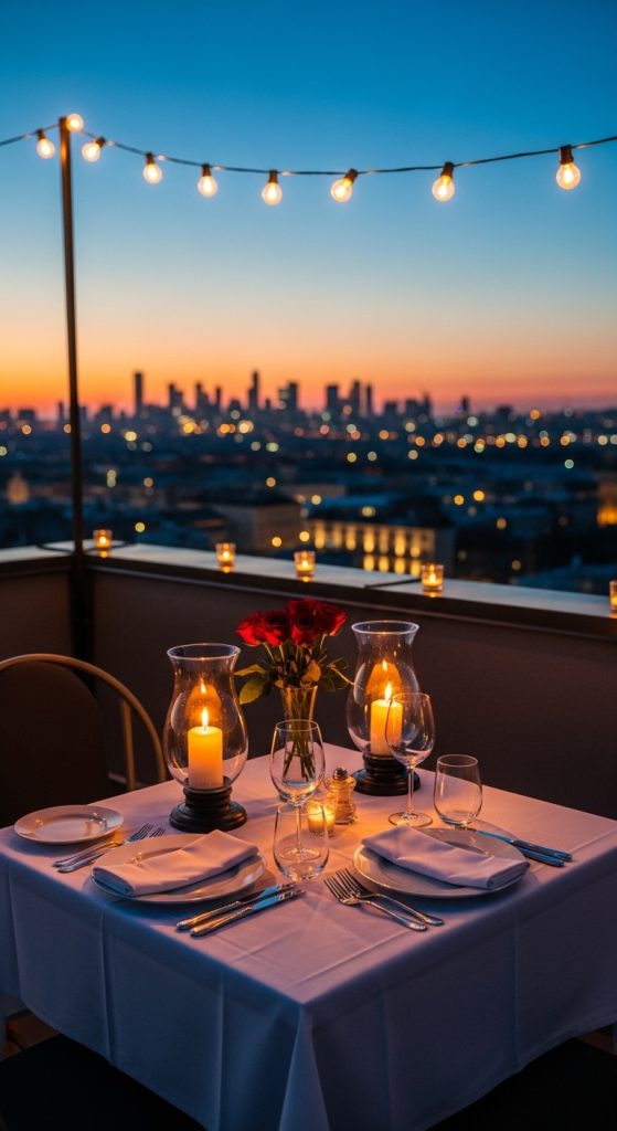 If you have access to a rooftop or terrace, set up a candlelight dinner under the stars. String lights, lanterns, and tea lights can add a magical glow. Pair the setting with a breathtaking sunset view to create a romantic and cinematic experience.