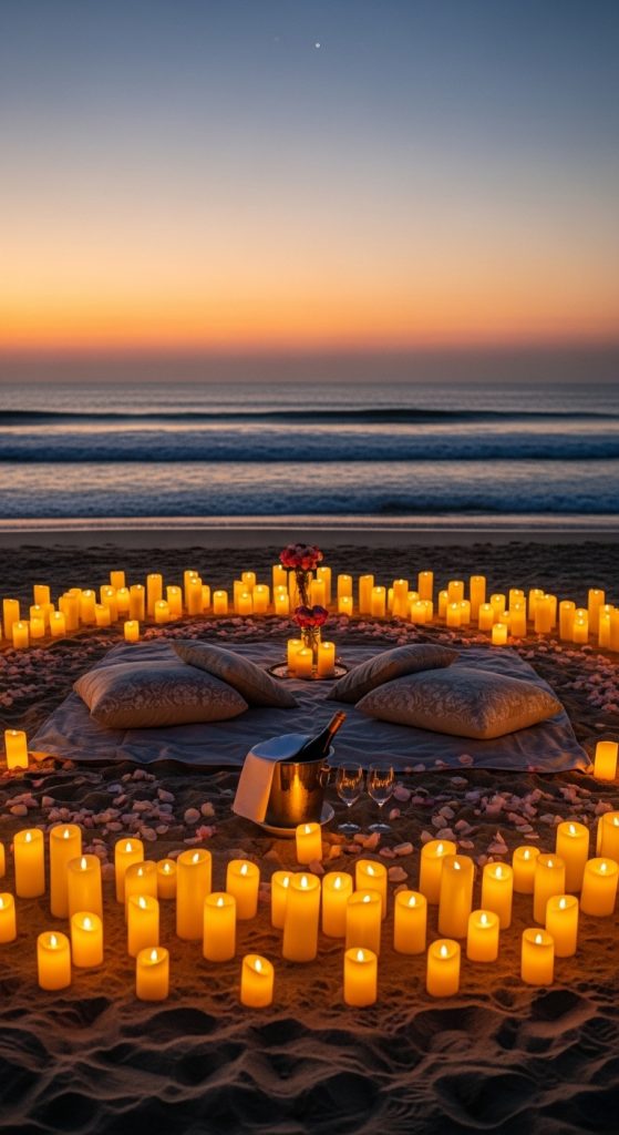 For couples near the coast, a candlelight dinner on the beach is ideal. Use lanterns and candles around a picnic blanket or a small table. The sound of waves, soft sand, and candlelight creates a dreamy atmosphere perfect for a birthday celebration.