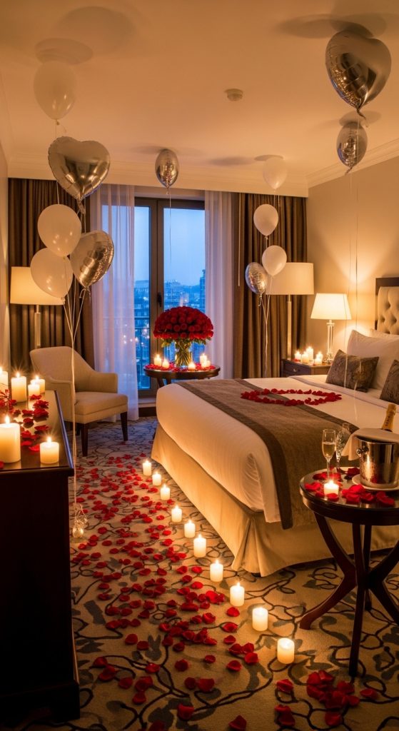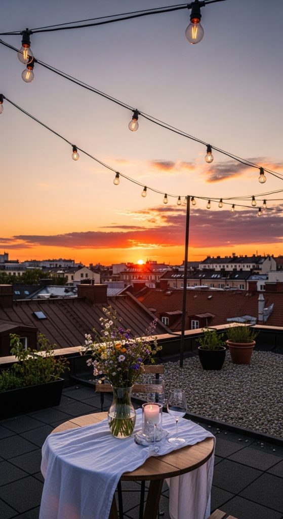 If you have access to a rooftop, set up a romantic dinner under the stars. Use string lights, lanterns, and a small table decorated with flowers and candles. A quiet cityscape or sunset view adds a cinematic and luxurious touch.