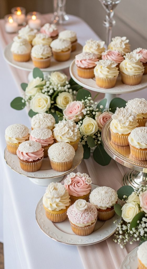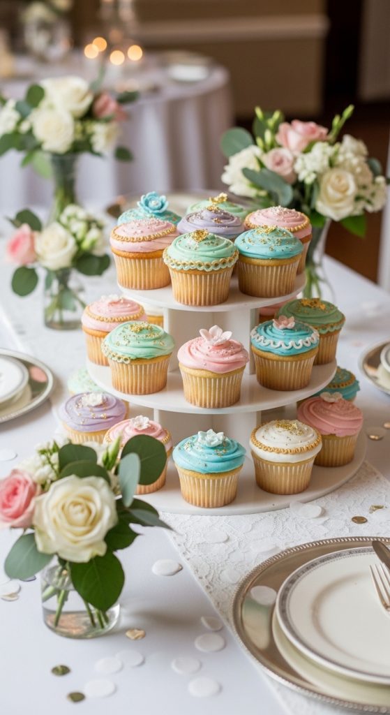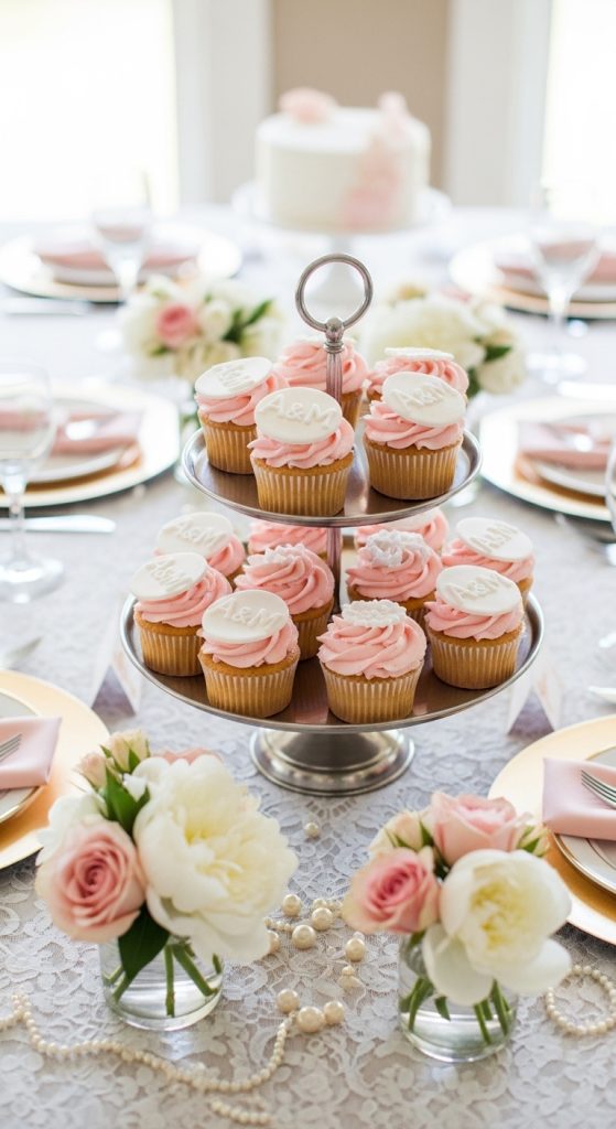 Add a personal touch by featuring the bride’s initials on each cupcake using edible fondant letters or icing. Pair with a simple pastel frosting base to let the monogram stand out. These personalized cupcakes make a statement and create a cohesive theme across your dessert table.