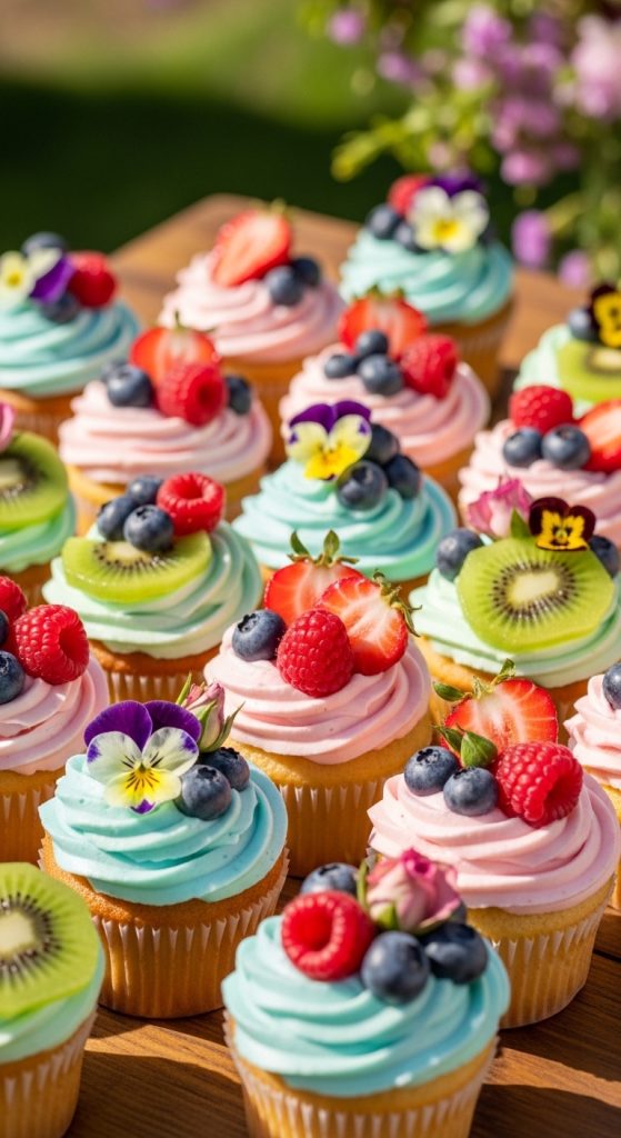 Add freshness and color with cupcakes topped with berries, kiwi, or edible flowers. Use lightly sweetened frosting to complement the fruit, creating a light, refreshing dessert option. Ideal for spring or summer bridal showers held outdoors.
