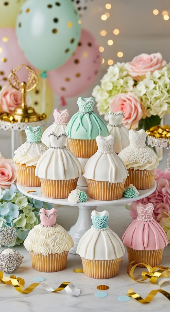 These themed cupcakes mimic the look of bridal gowns. Use white fondant or buttercream to create the skirt and a small sugar topper for the bodice. This whimsical design is playful, stylish, and perfectly bridal, making it an instant hit among guests.
