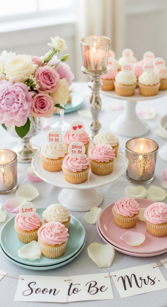 Write small messages like “Love,” “Bride-to-Be,” or the wedding date on cupcakes using edible markers or piping. Guests love the thoughtfulness, and it adds a personalized touch that reinforces the bridal shower theme.