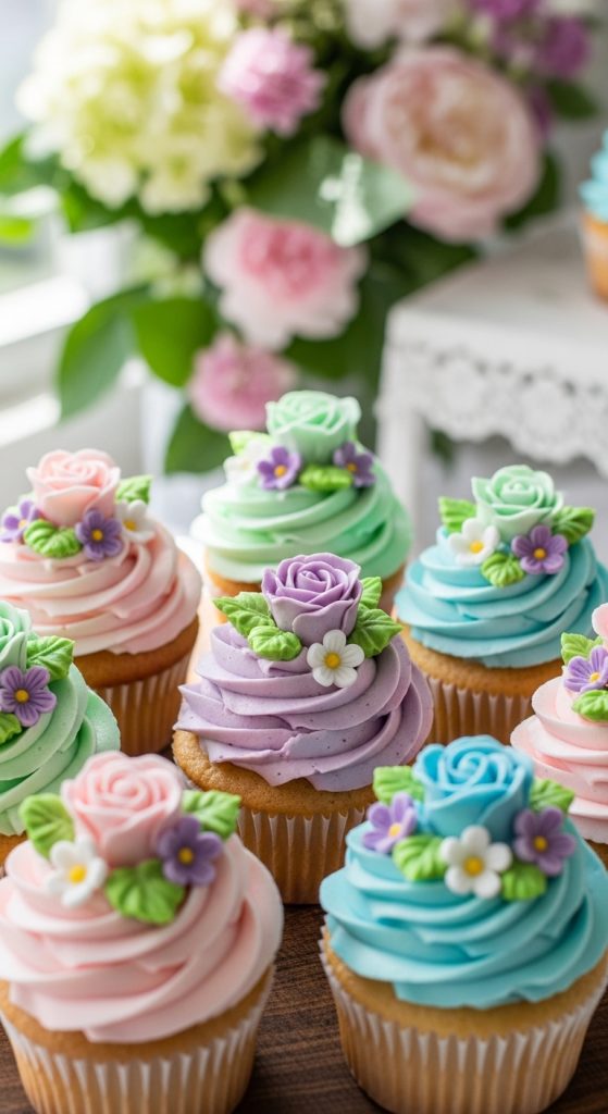 Floral buttercream cupcakes are timeless and elegant. Swirl soft pastel buttercream to create petals on top and garnish with edible flowers like violets, roses, or pansies. This design works beautifully for garden-themed or outdoor bridal showers, adding a romantic and luxurious touch to your dessert table.