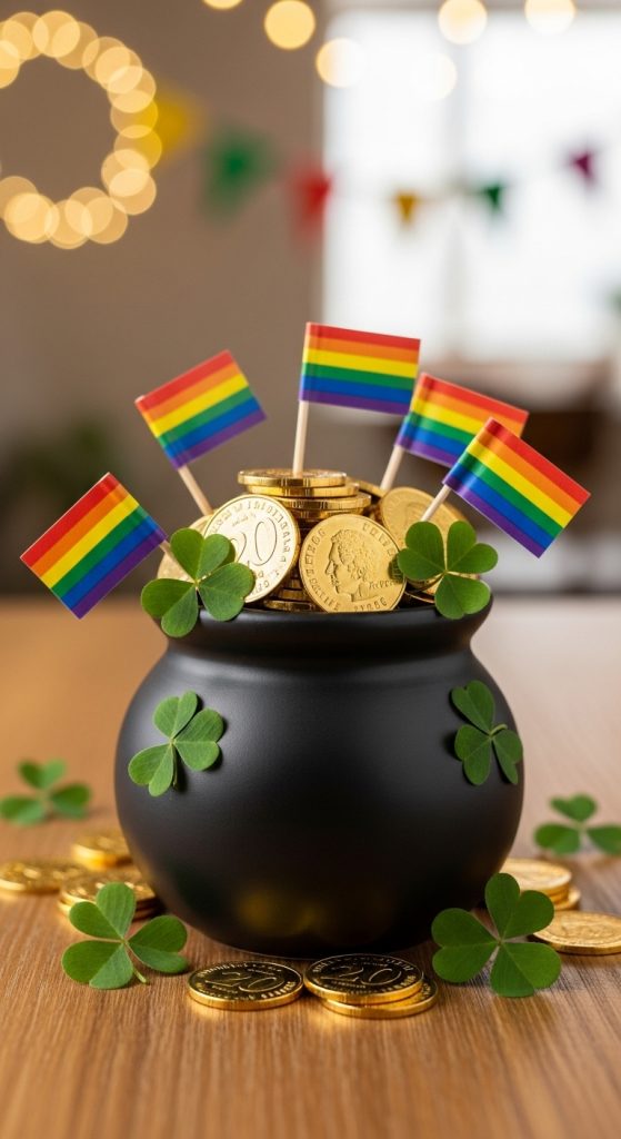 Transform a small plant pot into a “pot of gold” by painting it black and filling it with golden coins or faux gold nuggets. Add green shamrocks or miniature rainbow flags for a playful and festive decoration.