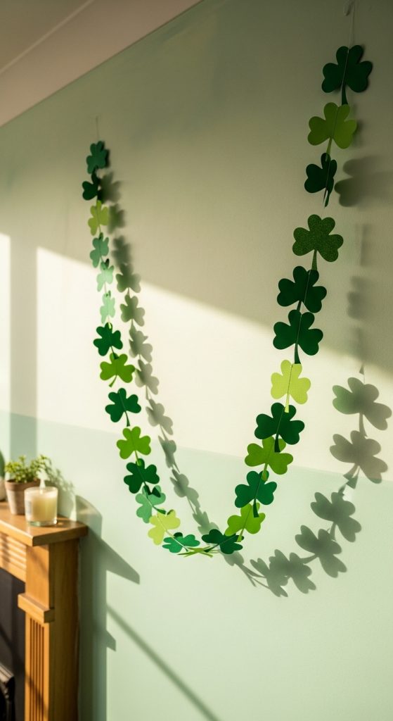 Create a festive garland by cutting shamrocks out of green construction paper or cardstock. Attach them to a string using tape or mini clothespins. Hang the garland across walls, windows, or above a party table for a cheerful St. Patrick’s Day touch.