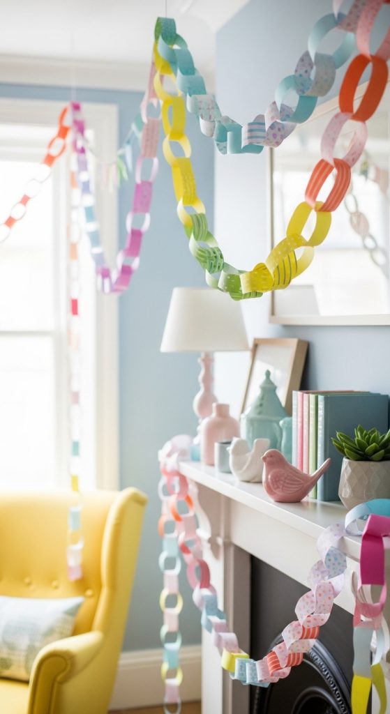 Cut colorful strips of paper in rainbow shades and loop them together to form a paper chain. Hang the chain across mantels, door frames, or party spaces. It’s a classic, budget-friendly, and eye-catching decoration.