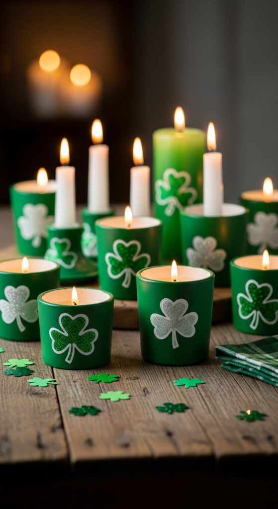 Transform plain candle holders with green paint, glitter, or adhesive shamrocks. Place candles inside for a cozy and festive ambiance. This DIY is simple, affordable, and perfect for both daytime and evening St. Patrick’s Day décor.