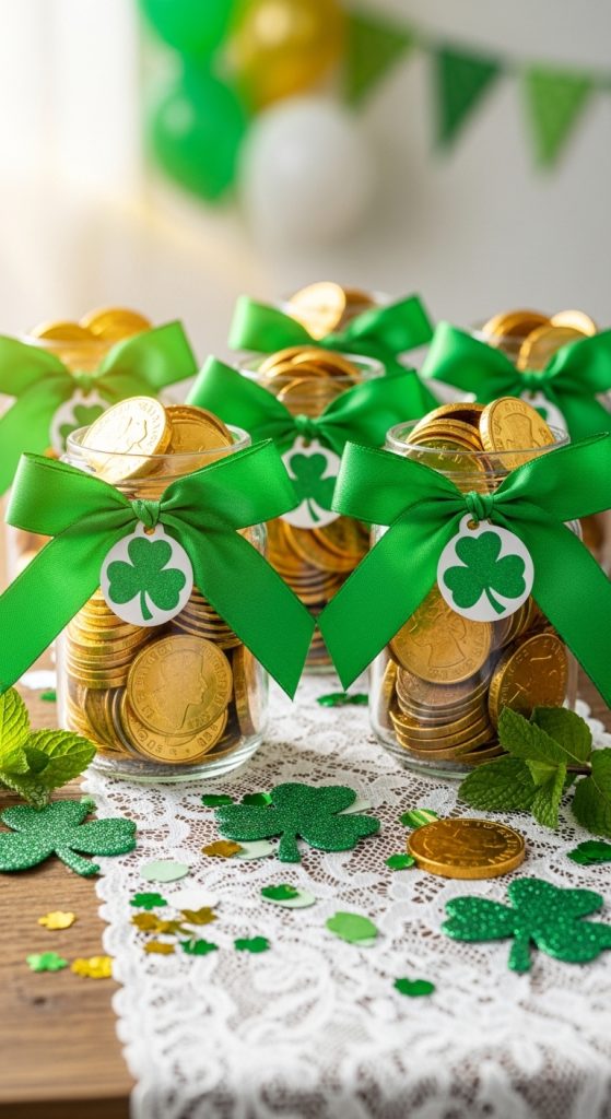 Fill small jars or bottles with gold-painted coins, chocolate coins, or green beads. Tie with green ribbon and add a shamrock tag. These jars can double as decorations and inexpensive party favors for guests.