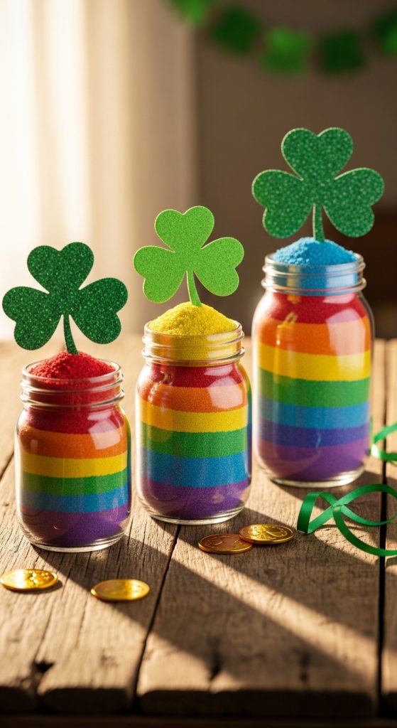 Use mason jars filled with rainbow-colored candy, beads, or even layered colored sand. Add a few green clovers or gold coins at the top. These eye-catching centerpieces are budget-friendly and easy to customize for any table or shelf display.