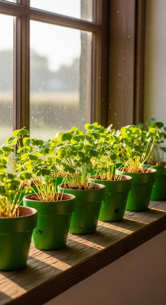 Use small terra cotta pots and paint them green or wrap with green ribbon. Plant small shamrocks or herbs inside for a living décor option. These mini pots are perfect for table decorations, gifts, or window displays.