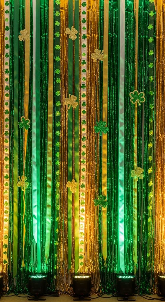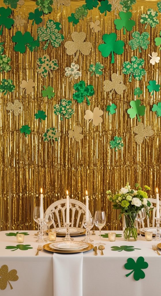 A metallic gold fringe curtain instantly creates a glamorous party atmosphere. Attach paper or foam shamrocks across the top or scatter them over the curtain for a layered effect.