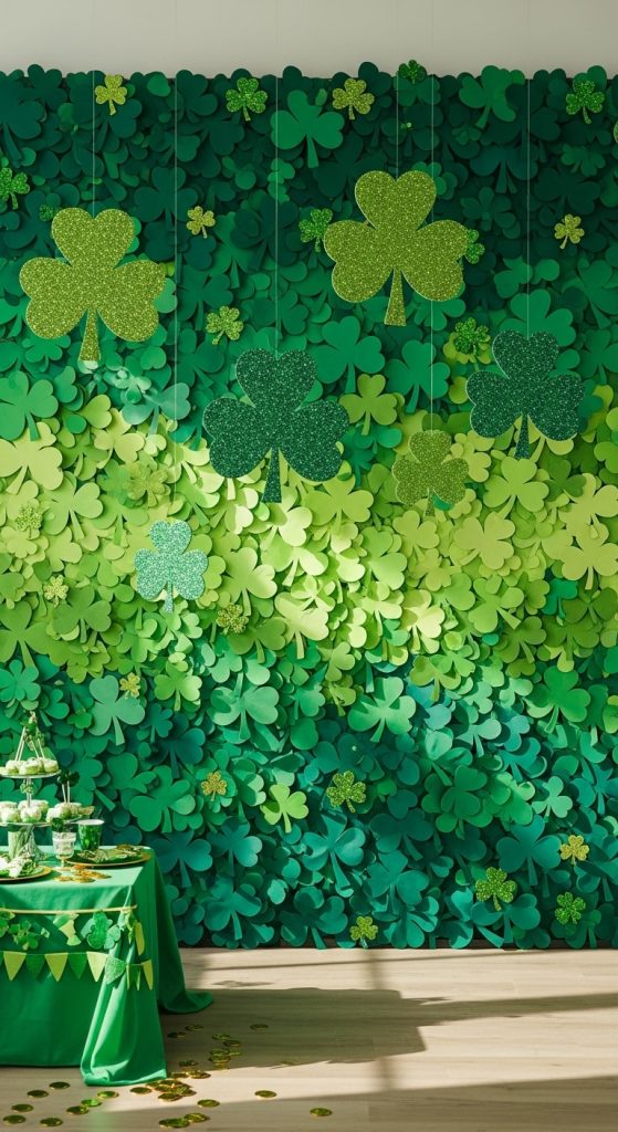 A shamrock wall is one of the most popular and easy DIY St. Patrick’s Day photo backdrop ideas. Cut out shamrocks in different shades of green—emerald, mint, sage—and attach them to a large white or gold background. You can use cardstock, foam sheets, or printable templates.