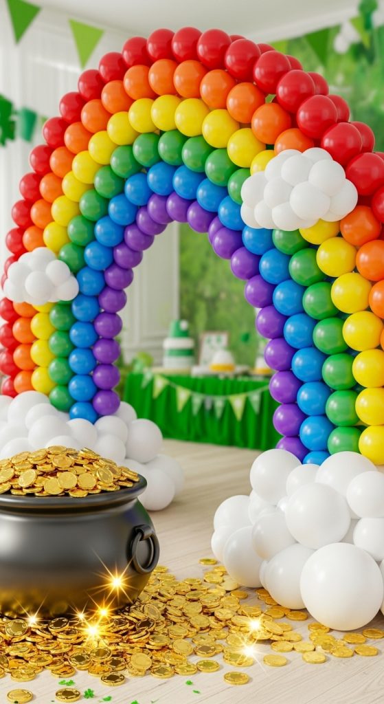 Nothing represents St. Patrick’s Day décor better than a rainbow leading to a pot of gold. Create a large rainbow using colored paper strips or balloons arranged in an arch shape. At the bottom, place a black pot filled with gold-painted coins or foil-wrapped chocolates.