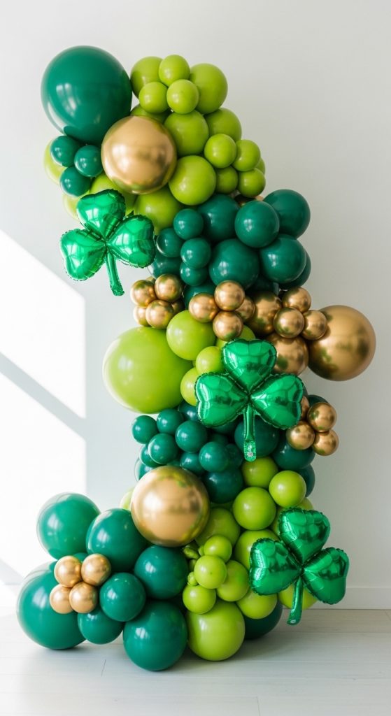 Balloon garlands are trending for all types of parties. For a St. Patrick’s Day theme, combine green balloons in different tones with white and gold balloons for contrast. Attach them in an organic garland style across a wall or arch frame.