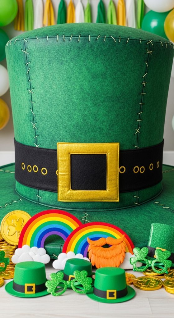 Design a giant leprechaun hat backdrop using cardboard or foam board. Paint it green and black, then add a gold buckle in the center. Guests can stand in front or behind it for fun themed photos.