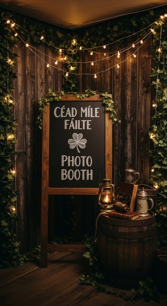 Create a cozy Irish pub-style corner using wooden textures, barrels, fairy lights, and vintage signs. Include phrases like “Happy St. Patrick’s Day” or traditional Irish blessings.