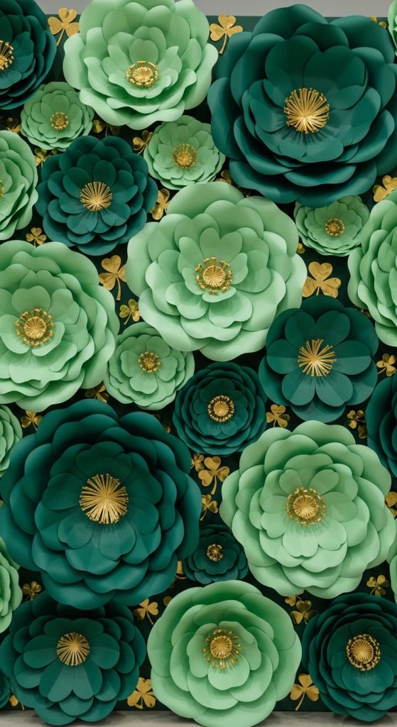Create oversized green paper flowers in different shades and attach them to a foam or cardboard base. Mix in gold paper leaves or shamrocks for texture.