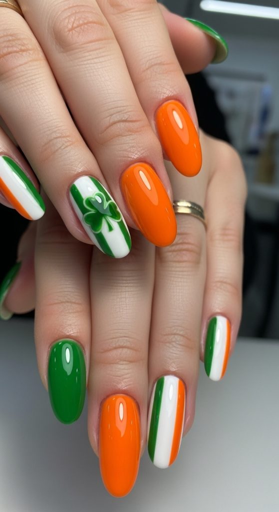 Show your Irish pride with the Irish flag nail design. Paint three vertical stripes—green, white, and orange—on one or multiple nails. Add a shamrock accent for extra festivity.