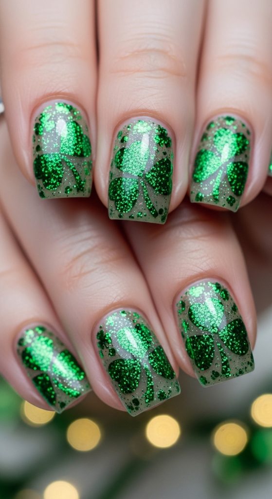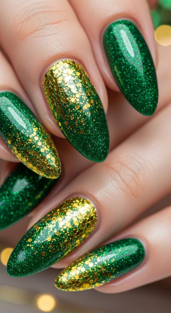 Green and gold glitter gradient nails are perfect for a bold St. Patrick’s Day look. Use a light green base and gradually add green and gold glitter from the tips down.