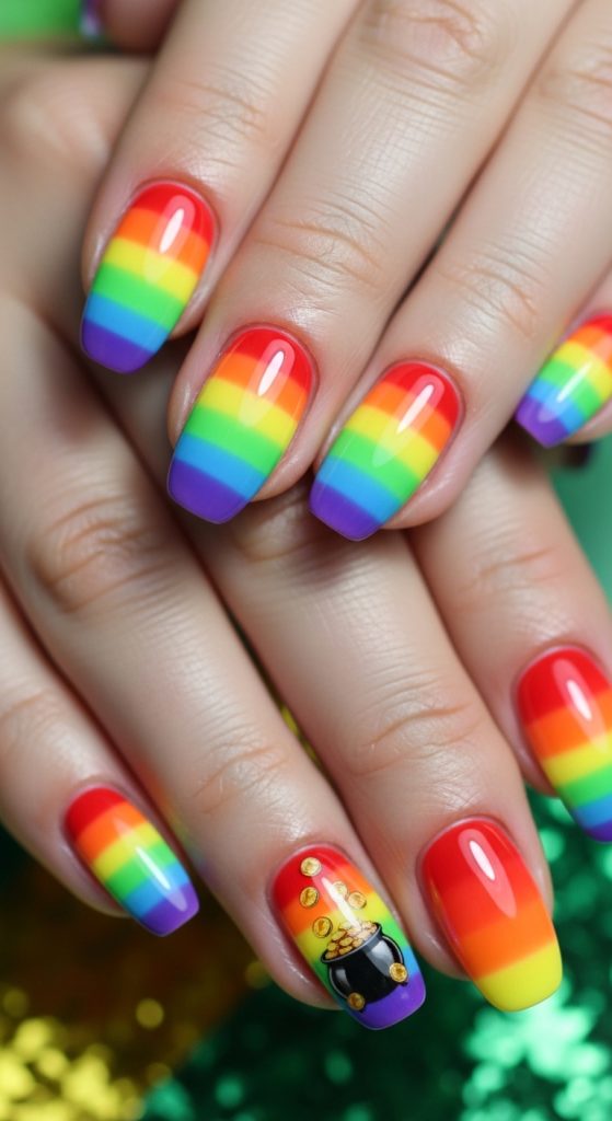 Rainbows are iconic for St. Patrick’s Day. Use a gradient technique to blend bright colors across your nails: red, orange, yellow, green, blue, and purple. Add a tiny pot of gold decal on one nail to complete the look.