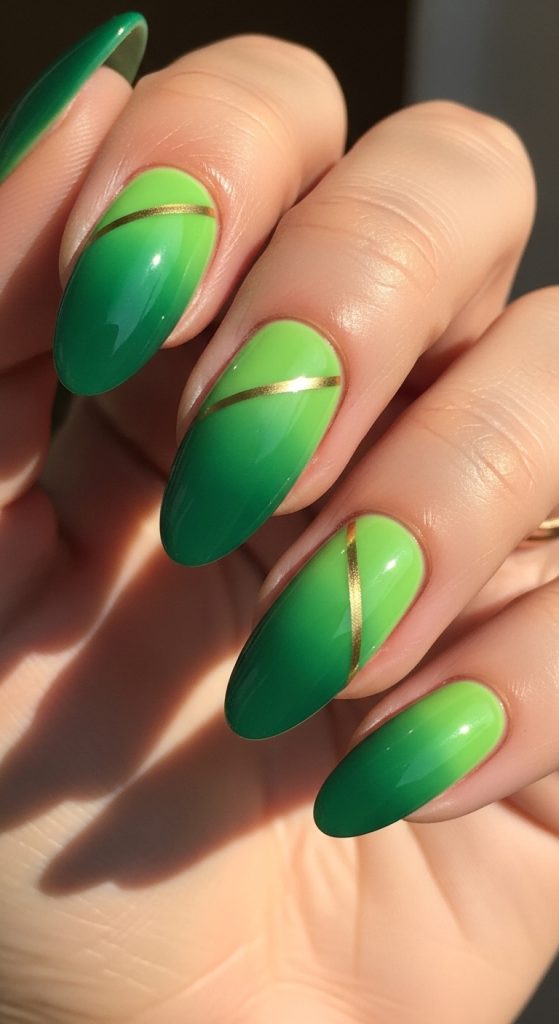 For a simpler option, green ombre nails are trendy and chic. Blend two or three shades of green from light to dark across your nails. Add gold stripes or small shamrocks for extra holiday flair.