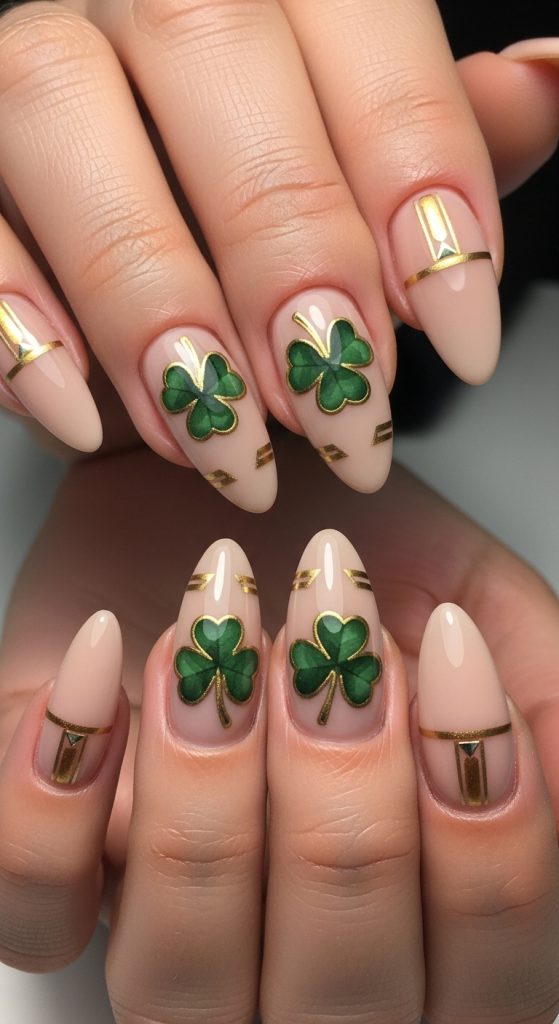 Combine neutral or pastel shades with metallic gold accents to create a classy St. Patrick’s Day manicure. Add gold stripes, glitter tips, or shamrock stickers to one or two nails for a subtle yet festive touch.