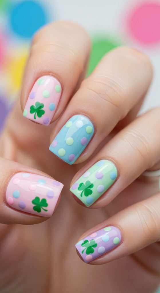 Create fun polka dot nails with small shamrocks on top. Paint nails in light green, pastel pink, or white and add tiny dots and shamrocks using a dotting tool or nail sticker.
