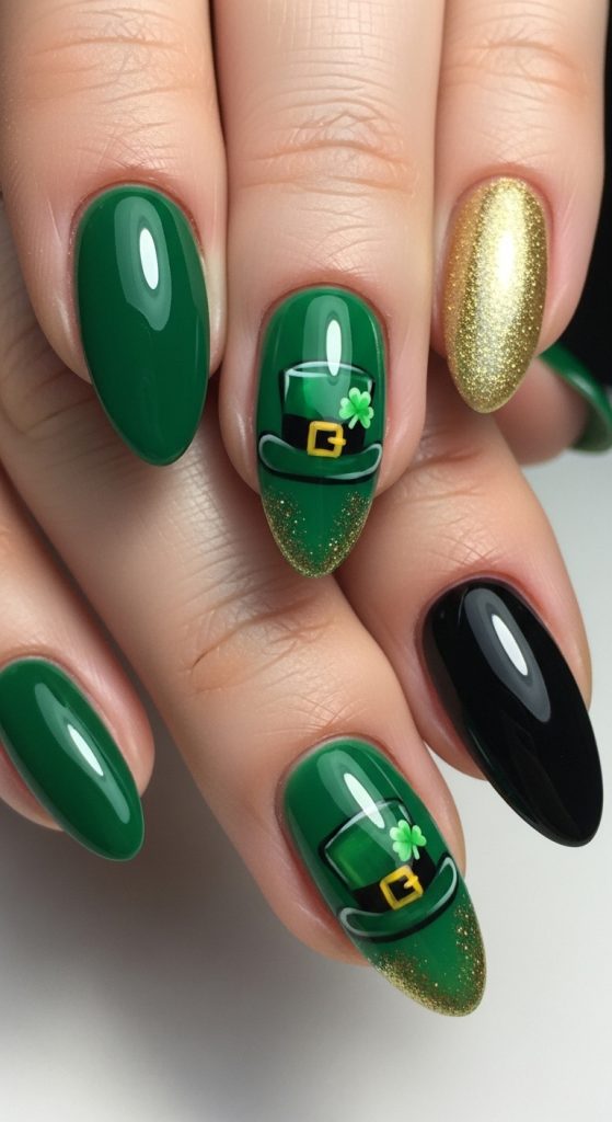 A playful design, leprechaun hat nails can be created by painting one nail with a green hat shape and black band with gold buckle. Use simple shapes and bold colors to make the design stand out.