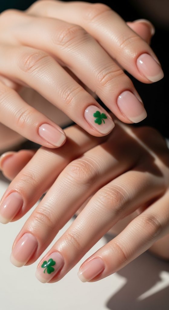 Minimalist designs are trendy and elegant. Paint nails a soft nude or pale green and add one small shamrock on each hand for a subtle holiday look.
