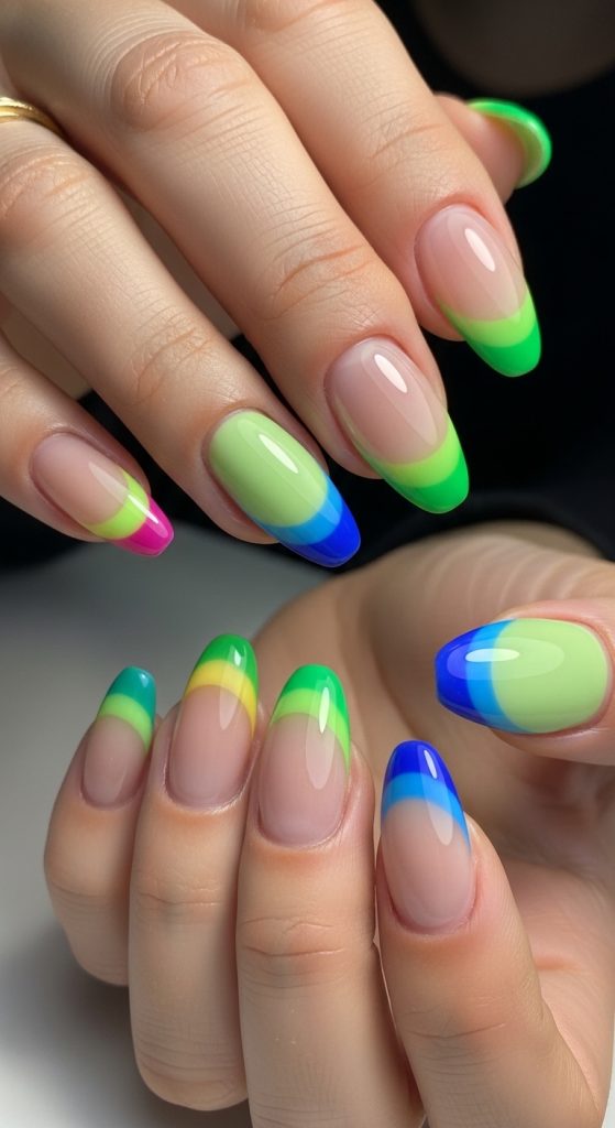 Update the classic French manicure with a rainbow twist. Paint tips with a rainbow gradient and keep the nail base neutral or pastel green. Finish with a topcoat for a professional look.