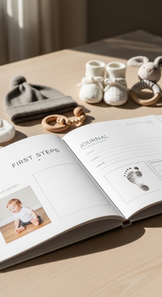 A baby memory book allows parents to document milestones, first words, and special moments.