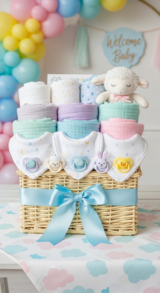 Create a themed baby gift basket with essentials like swaddles, bibs, pacifiers, baby lotion, and soft toys.