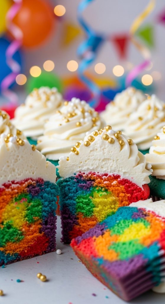 Finish with fluffy white frosting and edible gold sprinkles to resemble a “pot of gold.” These cupcakes are perfect for kids’ parties and themed celebrations.