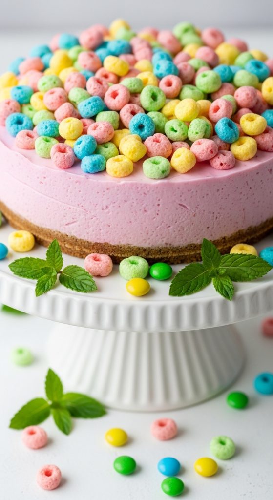 A no-bake cheesecake with crushed cereal crust and marshmallow toppings is both easy and festive. The colorful marshmallows add a playful texture and appearance.
