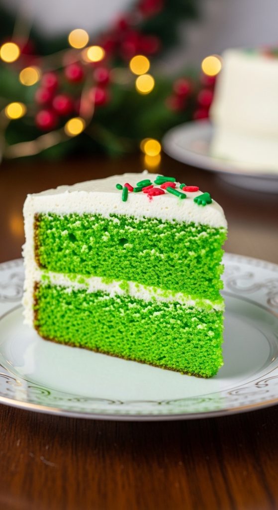 Green velvet cake is a festive twist on the classic red velvet recipe. Its vibrant color makes it stand out on any dessert table.