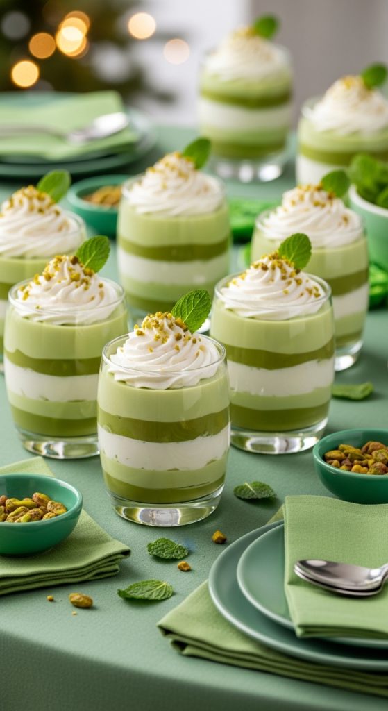 Layer pistachio pudding, whipped cream, and crushed cookies in clear cups to create beautiful parfaits. The natural green color of pistachio fits perfectly with the holiday theme.