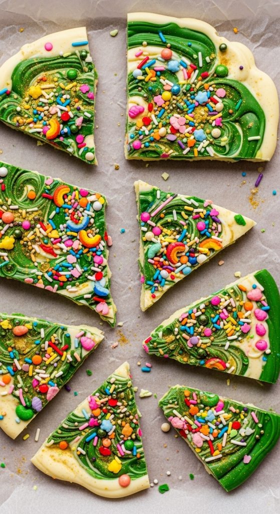 Leprechaun bark is a fun and colorful dessert made with melted white chocolate dyed green and topped with sprinkles, candy pieces, and edible gold dust.