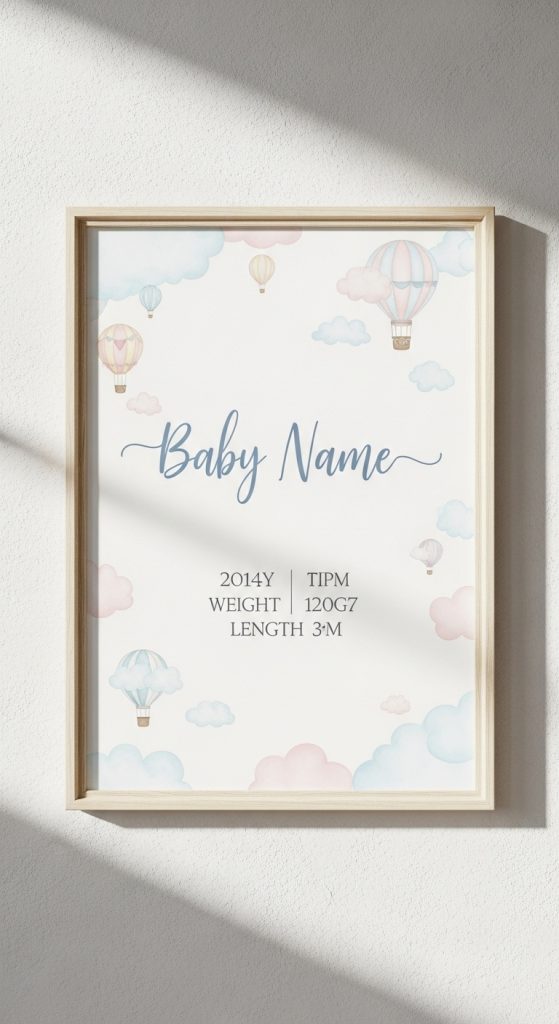 A personalized frame featuring the baby’s name along with birth date, weight, and time (to be added after delivery) makes a beautiful nursery decoration.