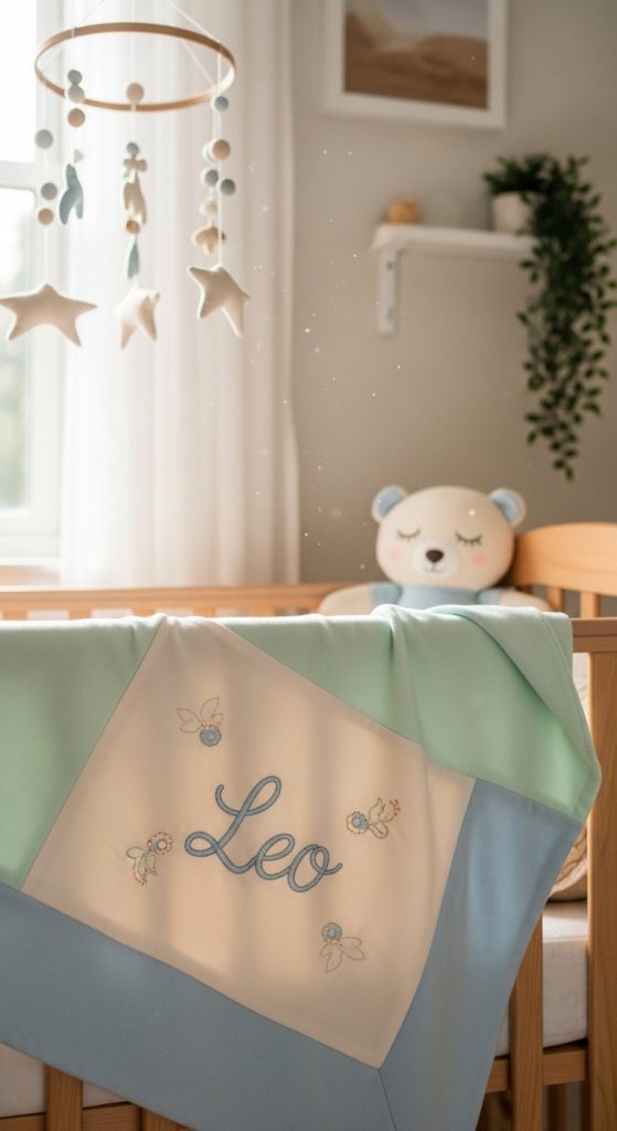 A soft, high-quality baby blanket embroidered with the baby’s name is a timeless keepsake. You can choose pastel shades, neutral tones, or match the nursery theme.