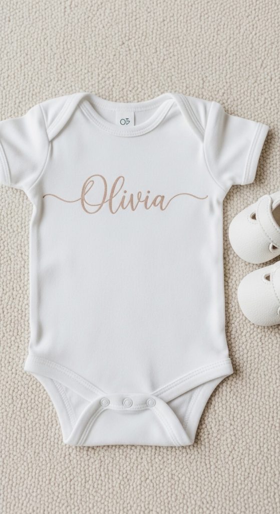 Custom onesies featuring the baby’s name or initials are both cute and functional. You can add fun phrases like “Hello, I’m [Baby Name]” or simply keep it minimal with elegant embroidery.
