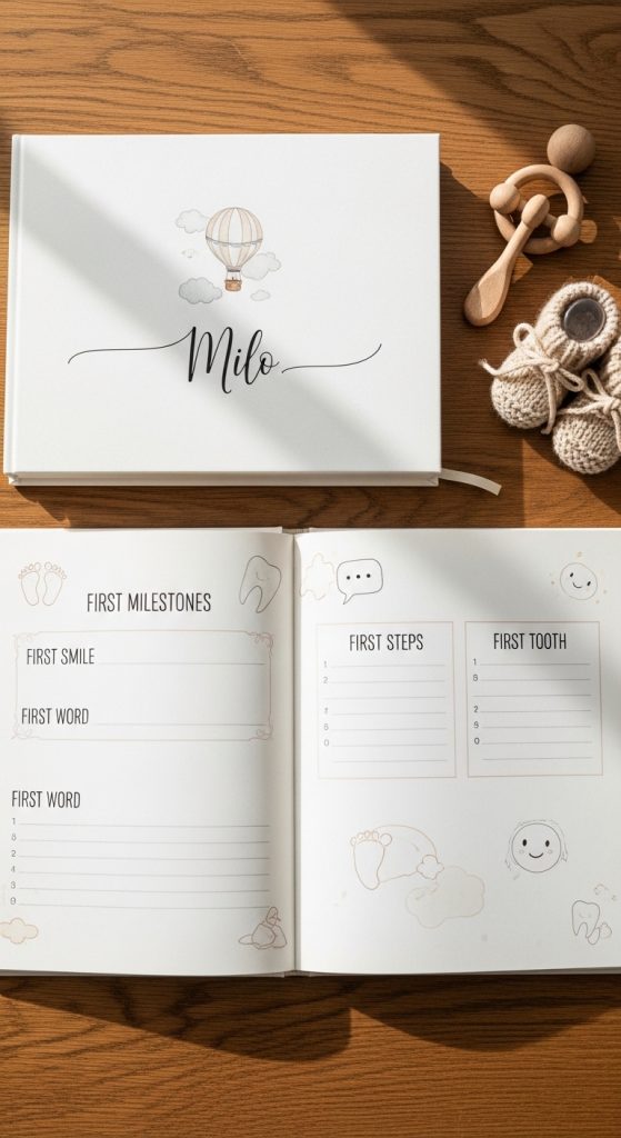 A custom baby memory book printed with the baby’s name on the cover adds a special touch.