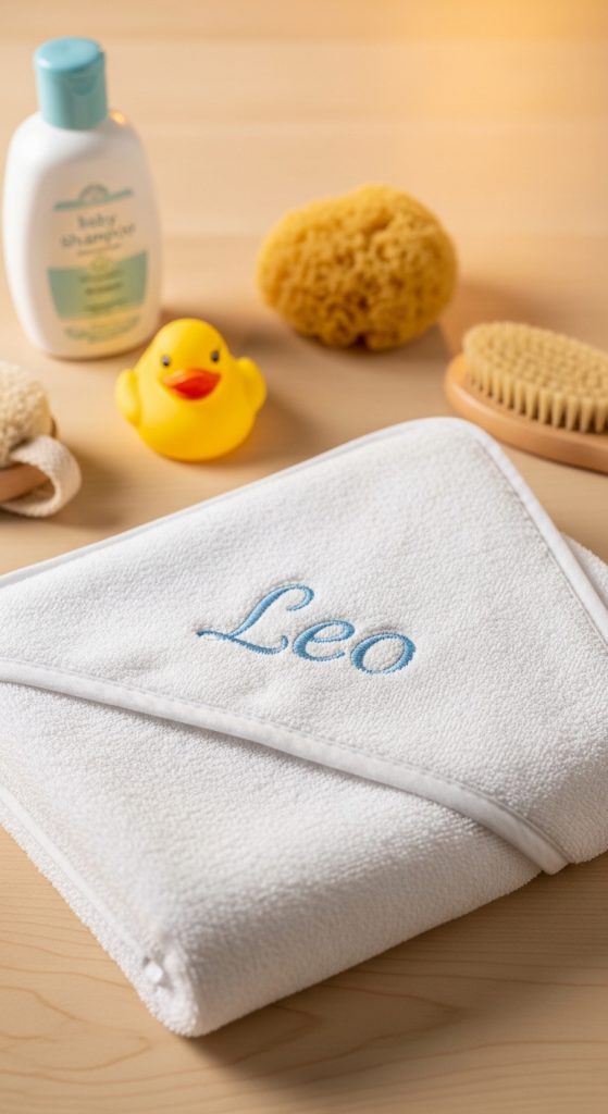 Bath time becomes extra special with a customized hooded towel embroidered with the baby’s name.