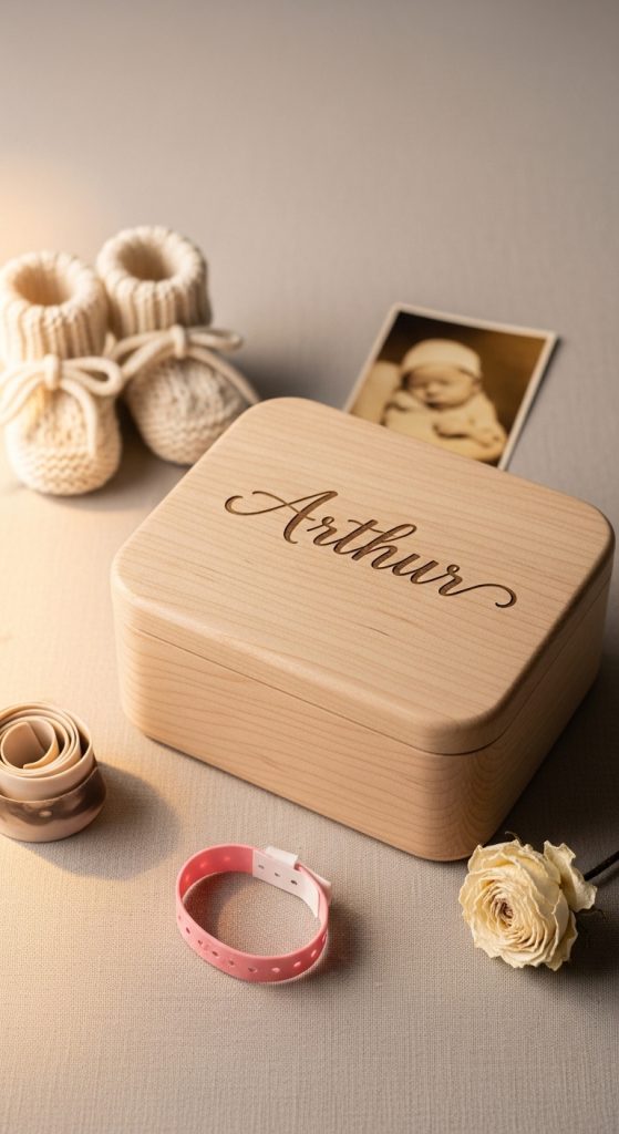 A custom wooden or acrylic keepsake box engraved with the baby’s name is perfect for storing first shoes, hospital bracelets, and other memories.