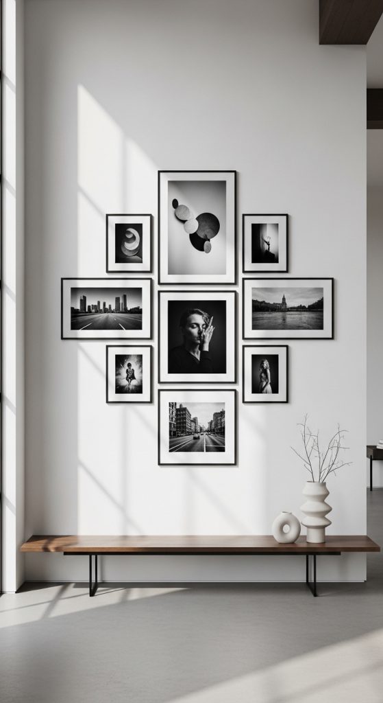Framed black and white photography adds timeless elegance to modern interiors. Choose urban, architectural, or nature-themed prints for a refined aesthetic.