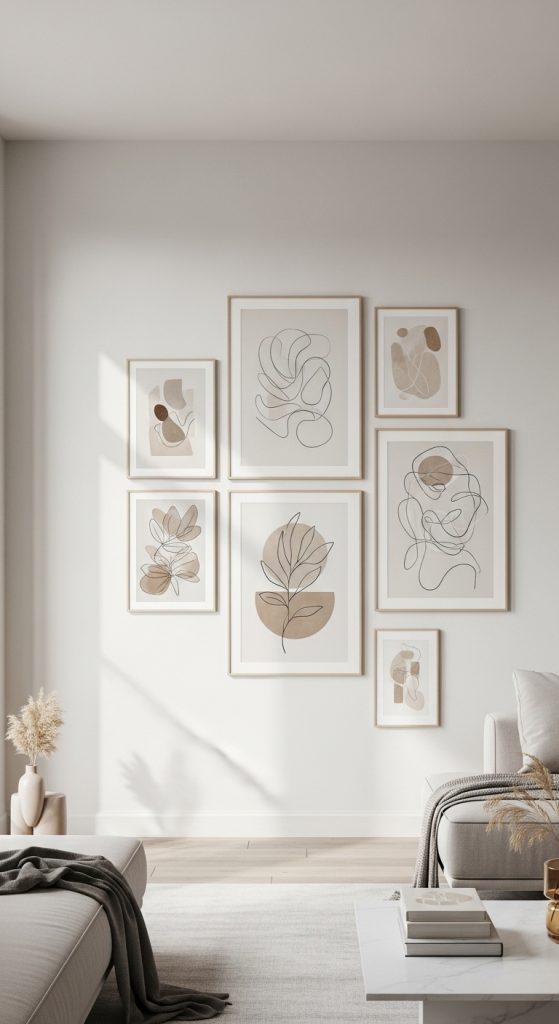 A curated gallery wall featuring modern art prints, typography posters, and neutral-toned photography creates a chic and balanced aesthetic. Use black, white, beige, or wooden frames for a cohesive look.