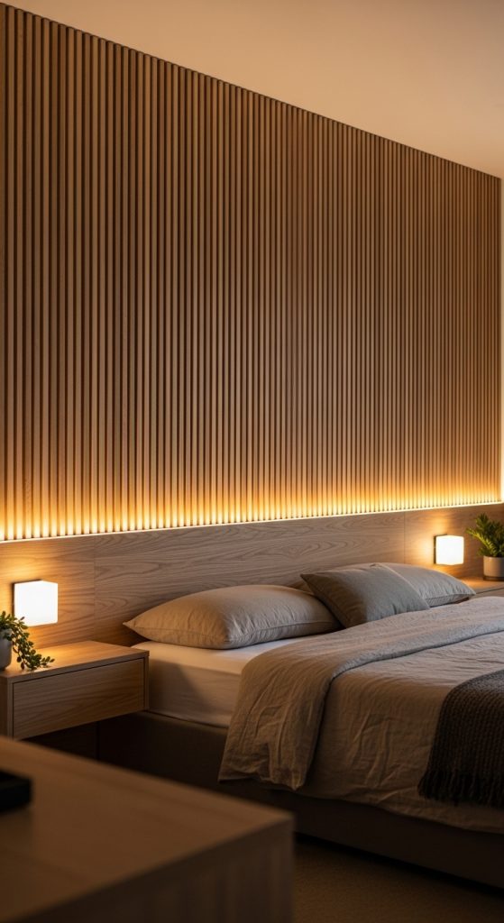 Vertical wood slat panels or subtle textured wall panels create dimension and warmth. This modern wall decor idea is perfect for accent walls in living rooms or behind beds.