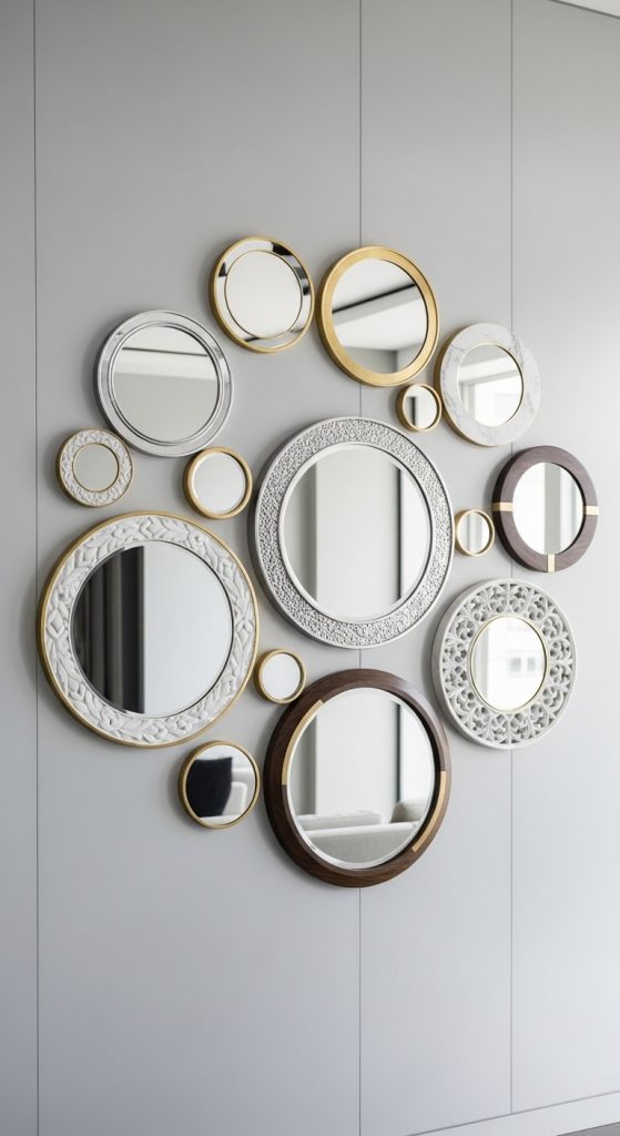 Round or asymmetrical mirrors arranged artistically on the wall make small spaces feel bigger and brighter.
