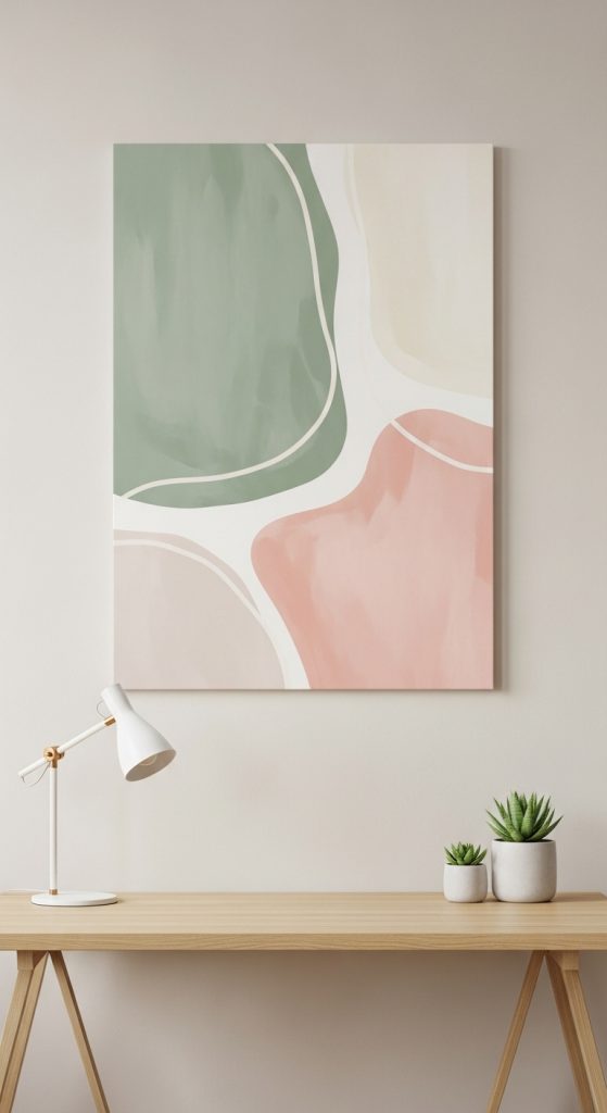 Abstract shapes in pastel pink, sage green, baby blue, or lavender create a calming atmosphere. You can paint organic shapes using acrylic colors or design digitally and print them.