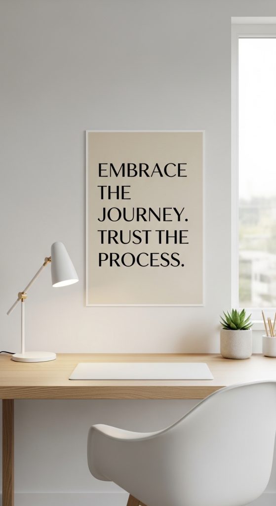 Create a typography-based poster featuring affirmations like “I Can and I Will” or “Progress Over Perfection.” Use layered fonts and soft shadow effects.